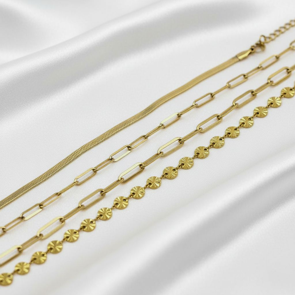 The Paperclip Sunburst Set layers a golden sunburst chain with a sleek herringbone and classic paperclip link - creating the perfect blend of light, texture, and timeless warmth.